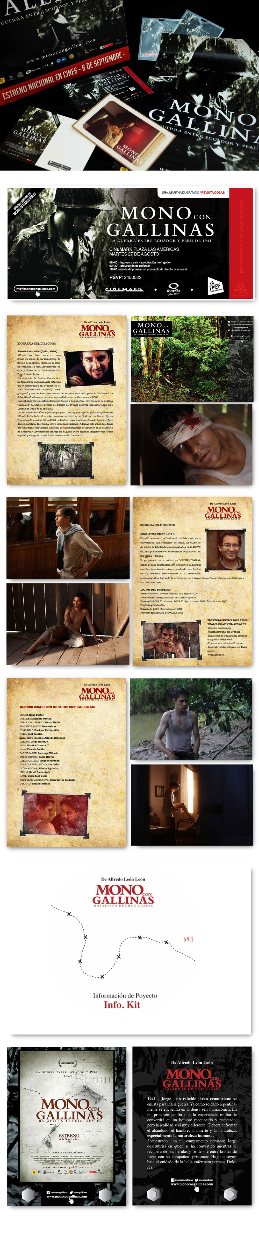 El primer gran reto de Relaciones Públicas fue la película del director ecuatoriano Alfredo León León. Corría el año 2013 y Alfredo se preparaba para lanzar su opera prima. Luego de incontables reuniones creativas y esbozos de ideas, llegamos a concordar en cuales serían los campos de acción para promocionar la película. El reto más grande era la falta de presupuesto, así que nos armamos de valor y convencidos del excelente producto que teníamos, nos lanzamos a diseñar una estrategia de comunicación. Generamos materiales gráficos y redactamos contenidos exclusivos para cada medio. Finalmente logramos nuestro objetivo y levantamos un número asombroso de publicaciones. Mono con Gallinas es un caso de éxito en cuanto a free press. Logramos llenar salas de cine y posicionar a Alfredo León como el nuevo director de cine ecuatoriano. Estamos ansiosos de empezar a trabajar “Sumergible” el nuevo reto cinematográfico de Alfredo León León.